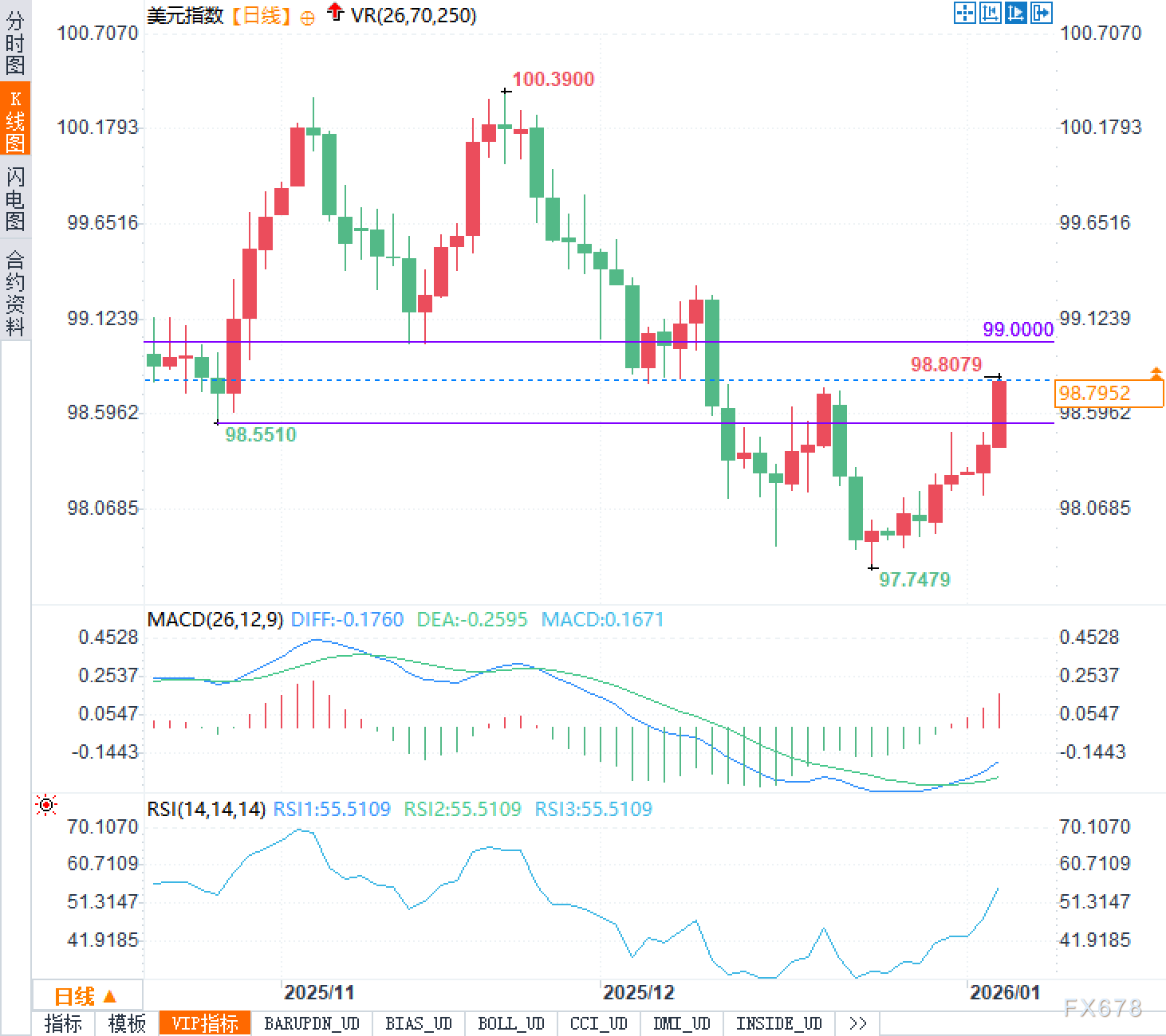 美元指数最近一段时间呈现“下跌后修复”的节奏。图形上,前高100.3900附近对应上行阻力带,随后价格回落并在97.7479附近形成阶段性低点,之后出现连续修复。当前98.80附近处于前期整理区间的中下部:99.0000一线更像短期多空分水岭,其上方能否站稳,往往需要更强的基本面触发;早前98.5510一带也曾成为回踩低点。